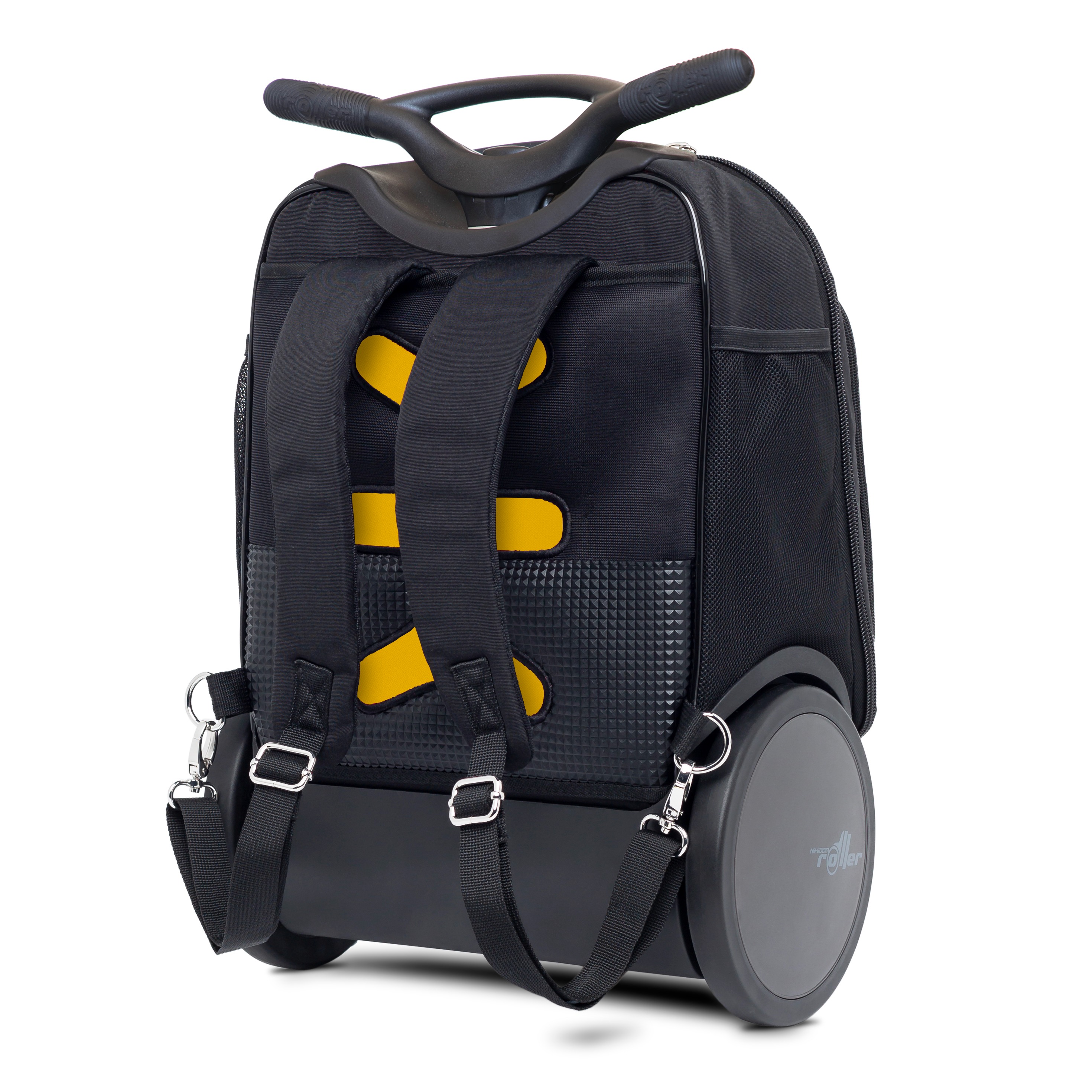 A nagy kerekeknek köszönhetően pedig a Roller könnyen legyőzi az utak akadályait, mint pl. a lépcsőket vagy a járdaszegélyeket. Nem utolsósorban a kerekek gumi bevonata biztosítja a halk közlekedést szinte alig hallhatóak, nem úgy, mint az átlagos bőröndöknél.